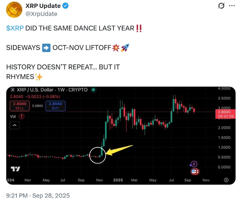 Пока XRP обдумывает свое существование вокруг отметки в 2.80 доллара, мы не можем не слышать отголоски его движений конца 2024 года. Исторические данные… о, этот жестокий, обманчивый зверь, каким он является, предполагают, что эта довольно небрежная динамика цен может скрывать скрытый потенциал для роста на 20%, словно феникс, возрождающийся из пепла — или, возможно, просто голубь, пытающийся взлететь.